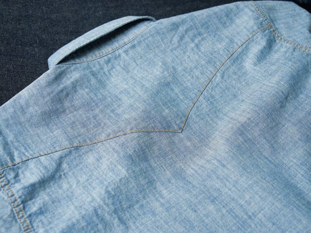 バックヨークは今年から採用された一山のシンプルなデザイン。デニムシャツなどは二山や三山のタイプのヨークもラインナップしている。