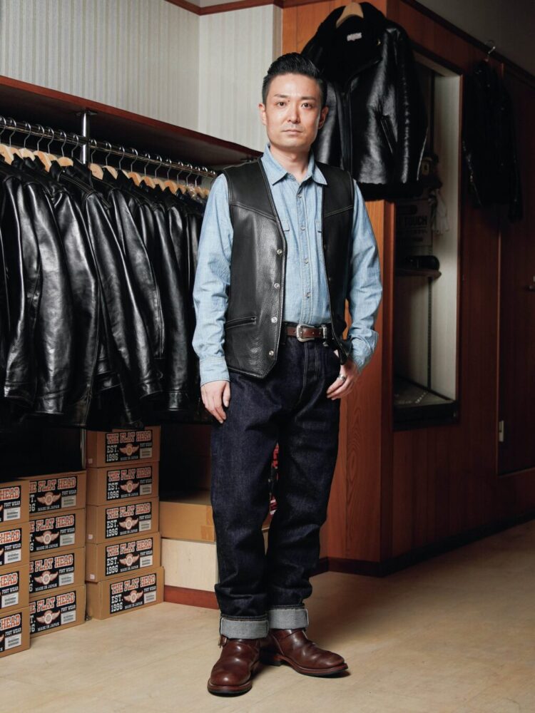 そう語ってくれたのはフラットヘッド神宮前店の田中店長。今回のスタイリングではシャンブレー生地で仕立てたウエスタンシャツを使い、シンプルで男らしい着こなしを提案してくれた。レザーベストはどこかカウボーイを思わせる佇まいで、シャツとの相性は言わずもがな。タックインすることで細身のウエスタンベルトをさり気なく主張しつつ、ベルトと同色のブラウンのエンジニアブーツを合わせることで、開拓時代の空気を感じさせる技アリなコーディネイトに仕上がっている。