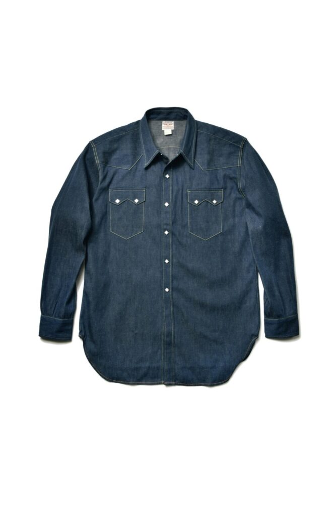 ベースは’60年代製のデニムウエスタンシャツ。アイテム名にも冠されているとおり、ノコギリの歯に似た、通称ソー・トゥースと呼ばれる胸ポケットが特徴だ。経糸のロープ染色の回数を倍以上に増やしたうえで、薄い色をレイヤリングすることによって、当時の深みある淡いブルーを忠実に再現した中白デニムを使用している。