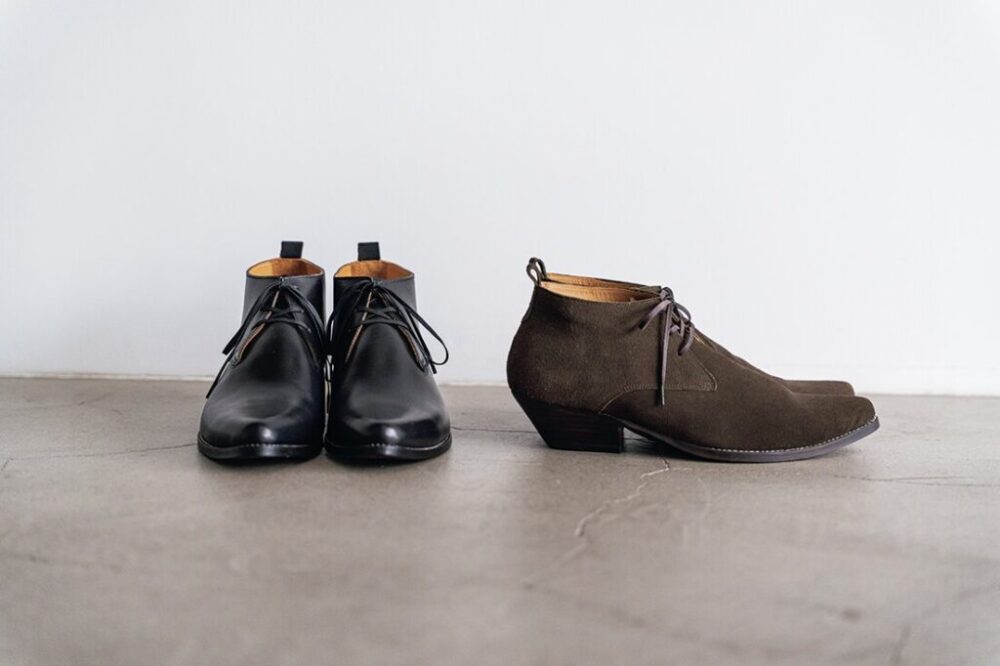 シューズまで展開する点にこだわりを感じる。ポインテッドトゥのオリジナルラストを用いたエレガントなレースアップブーツ。日本製。右/11万5500円、左/13万2000円