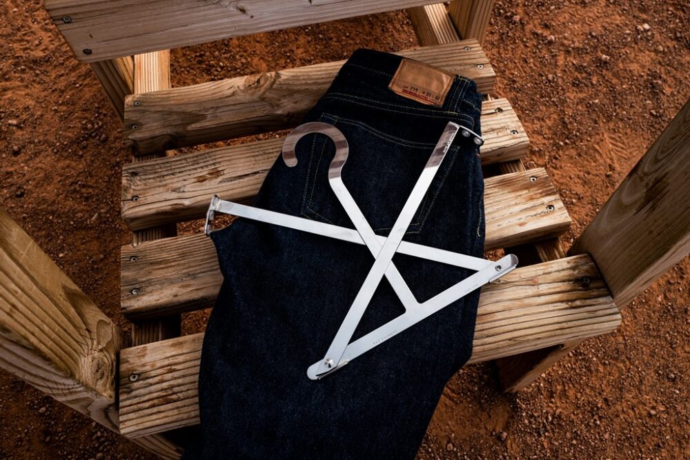 X字型可動式アームでデニムをやさしく支え、ステンレスとシリコングリップで生地のエイジングも守る設計。