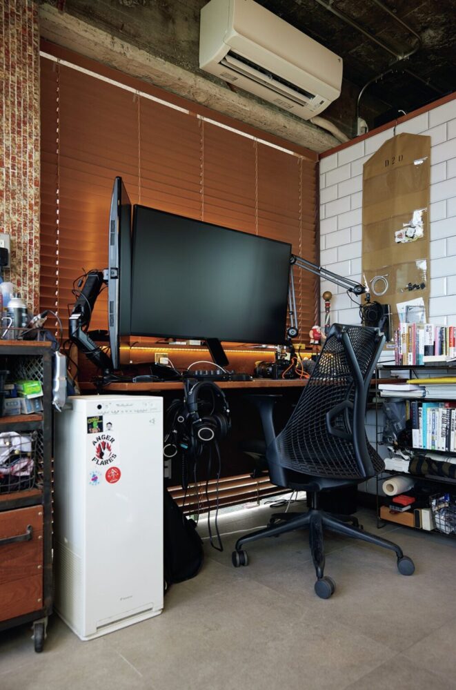 店舗隅のPCスペース。ポッドキャストのオンライン収録や各種オンラインミーティングを日常的に行う。