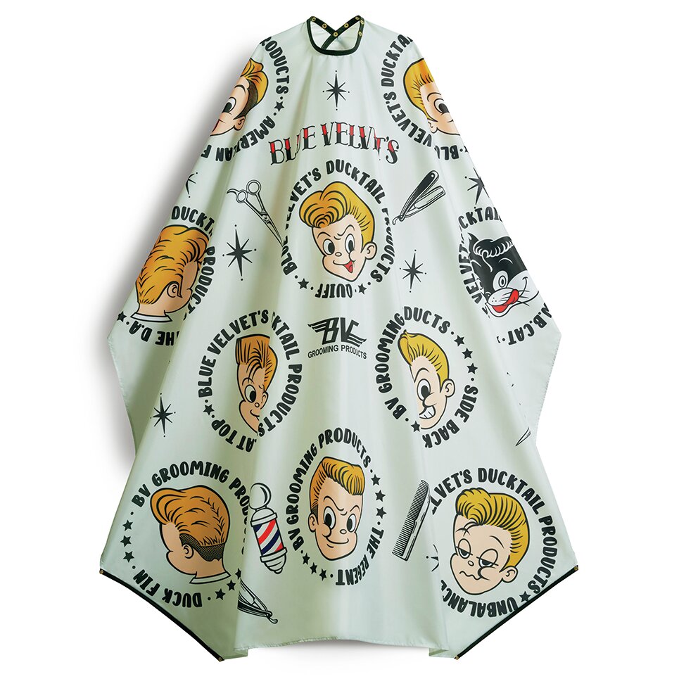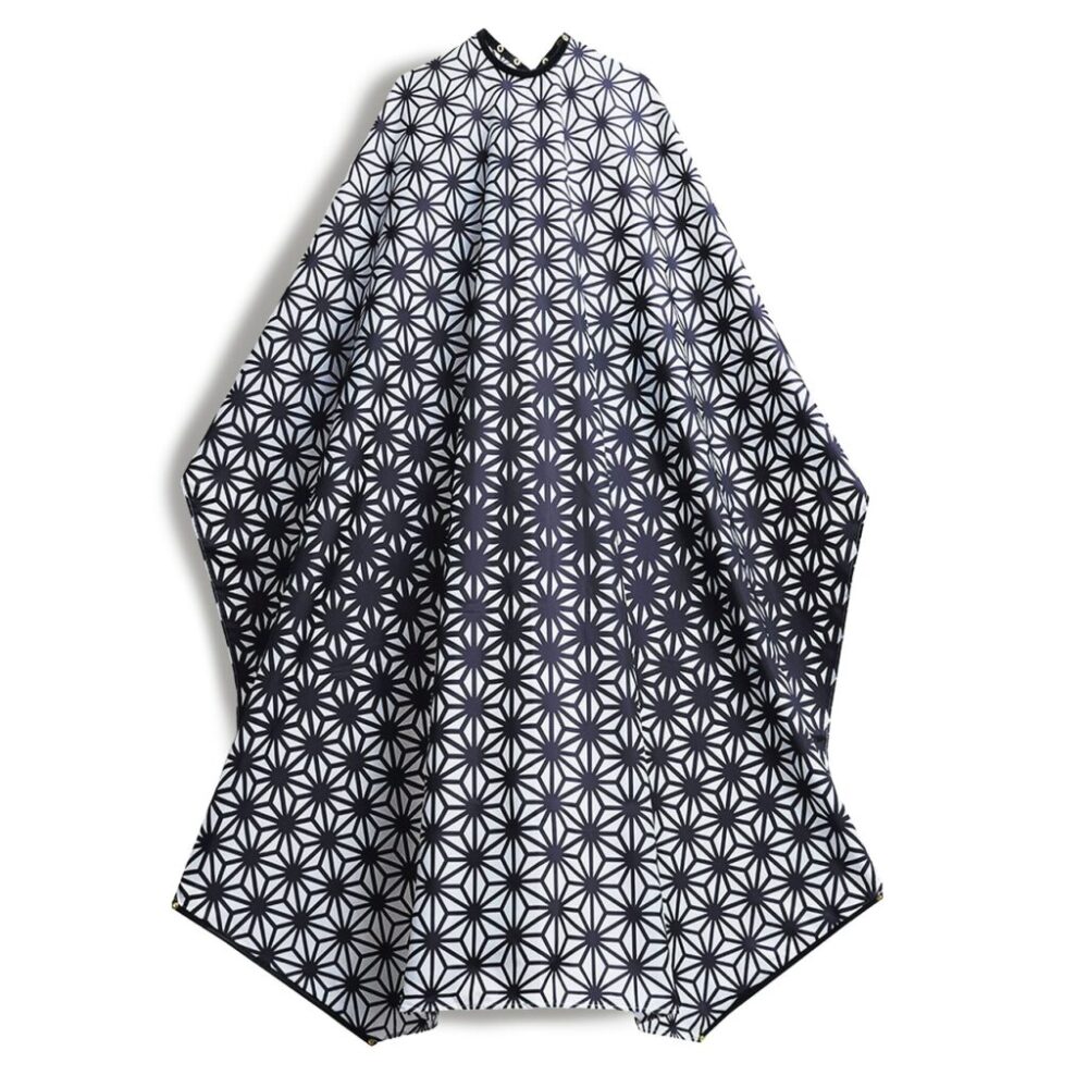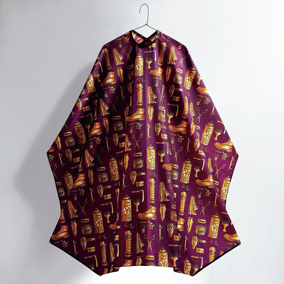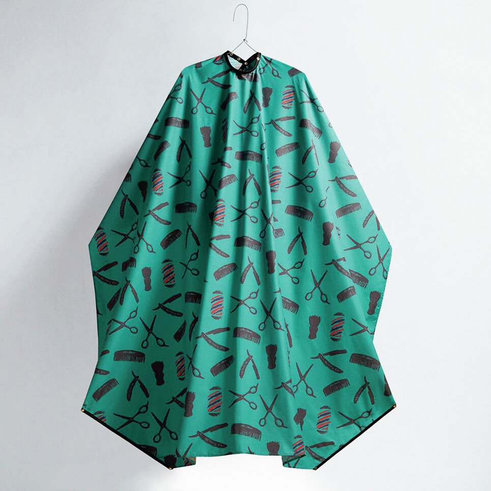 仙台バーバーカルチャーを牽引する『BSC(Barber Style Club)』別注ケープ。バーバーの道具をイラストでズラリ。