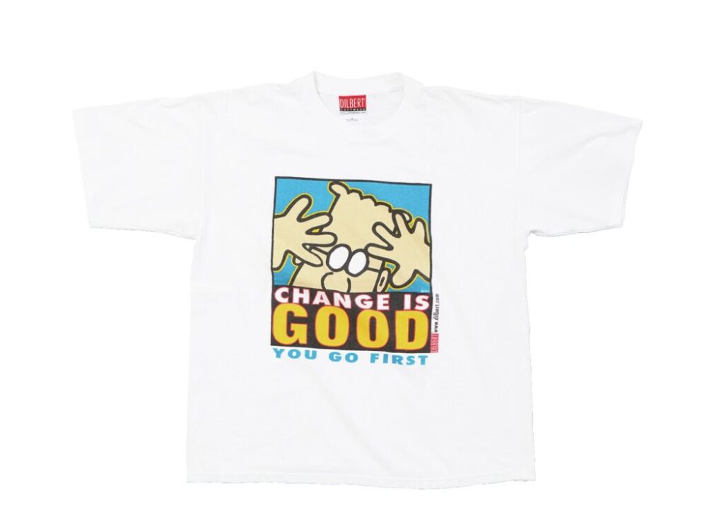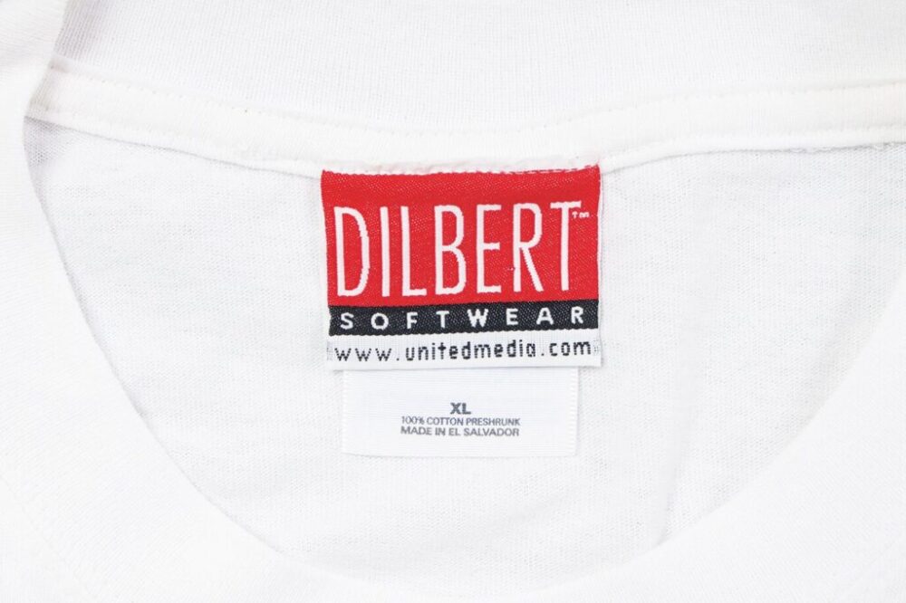 1989年から新聞掲載されたコマ割り漫画。作者「スコット・アダムス」によるディルバートというエンジニアを主人公にした企業が舞台の職場文化を風刺した作品。Tシャツでは1コマと文字で表現されている。気の抜けたタッチと明るい色使いを裏腹に鋭いところを突いてくる目線と考え方が光る。デザインだけで選びがちなTシャツだがコチラは漫画の内容も込みで選ぶと良いだろう。