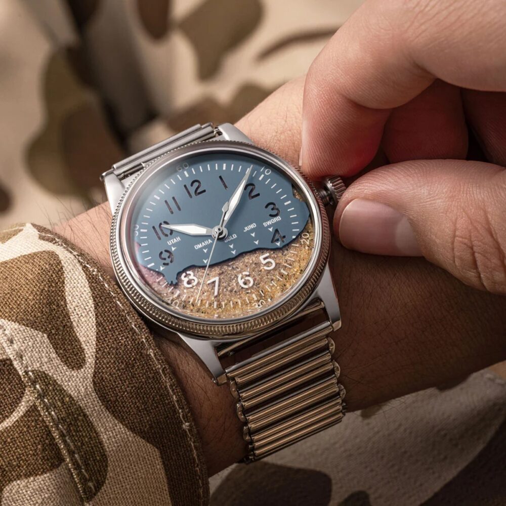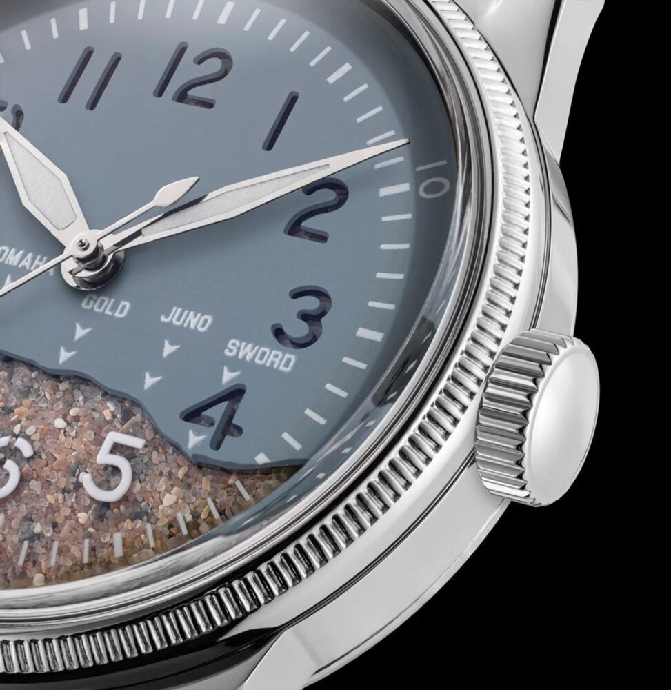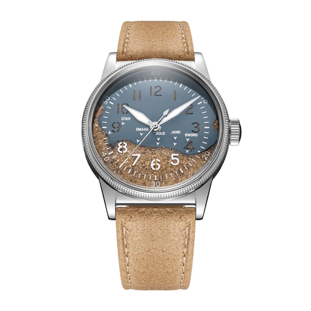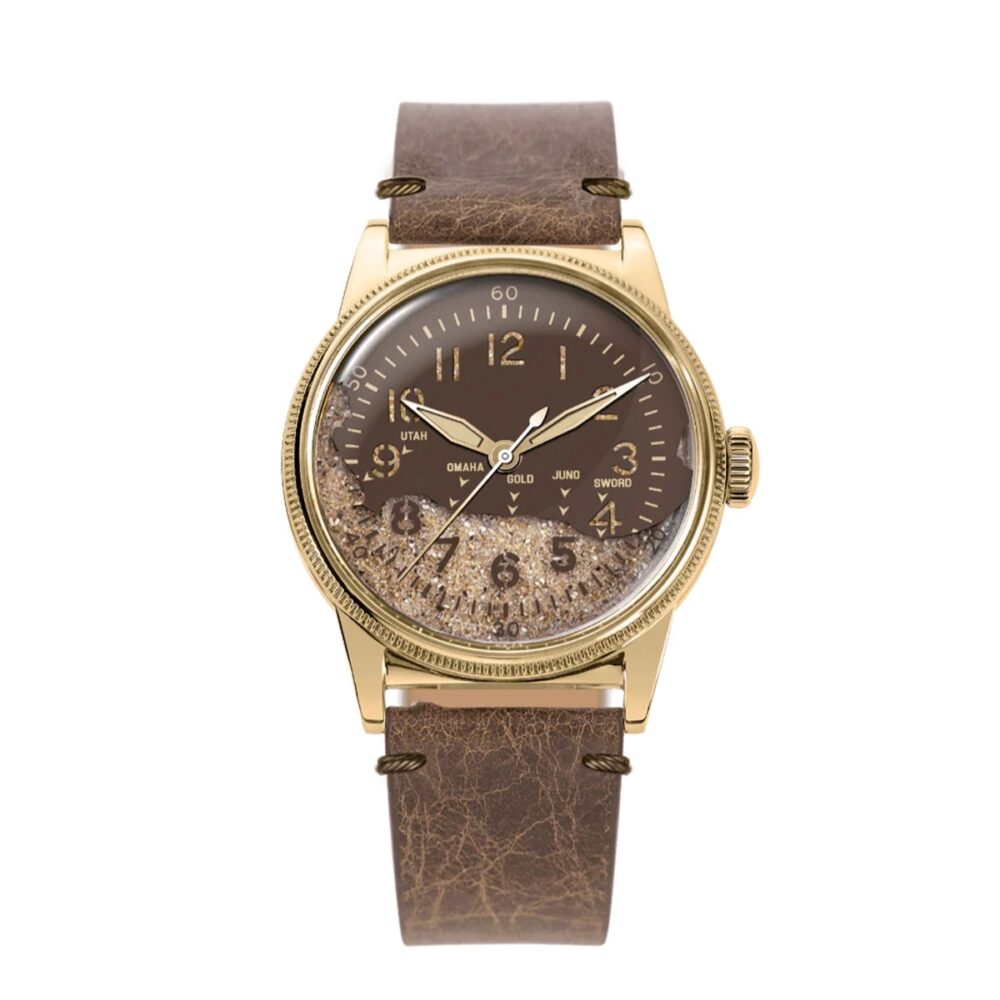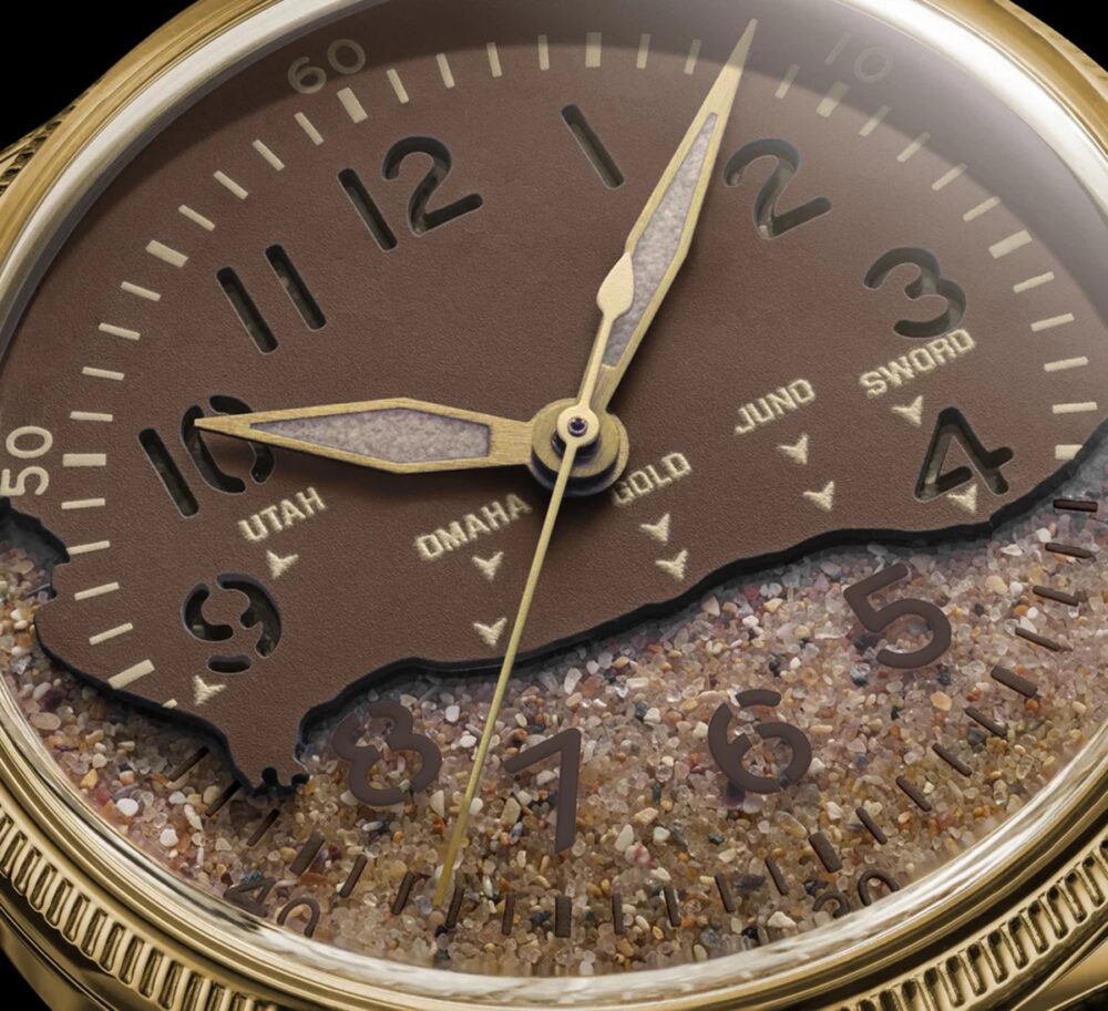 ノルマンディー上陸作戦から81周年を迎え、平和の記念として作られた特別なモデルである。最大の特徴は、実際にユタ・ビーチから採取された砂を文字盤に封じ込めたダイヤル。上半分は砂がそのままインデックスとして現れ、下半分にはホワイトの蓄光インデックスを配置。ノルマンディー海岸線をかたどったカットアウトと、5つの上陸地点のマーキングが歴史の記憶を鮮明に刻む。ケースバックには勇気を象徴するD-Dayの印象的なイメージを刻印。シリアルナンバー入りで、一本ごとに唯一無二の存在感を持たせている。