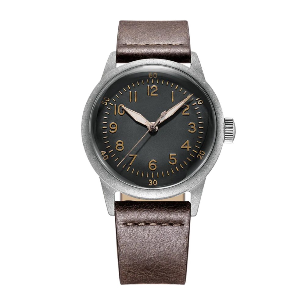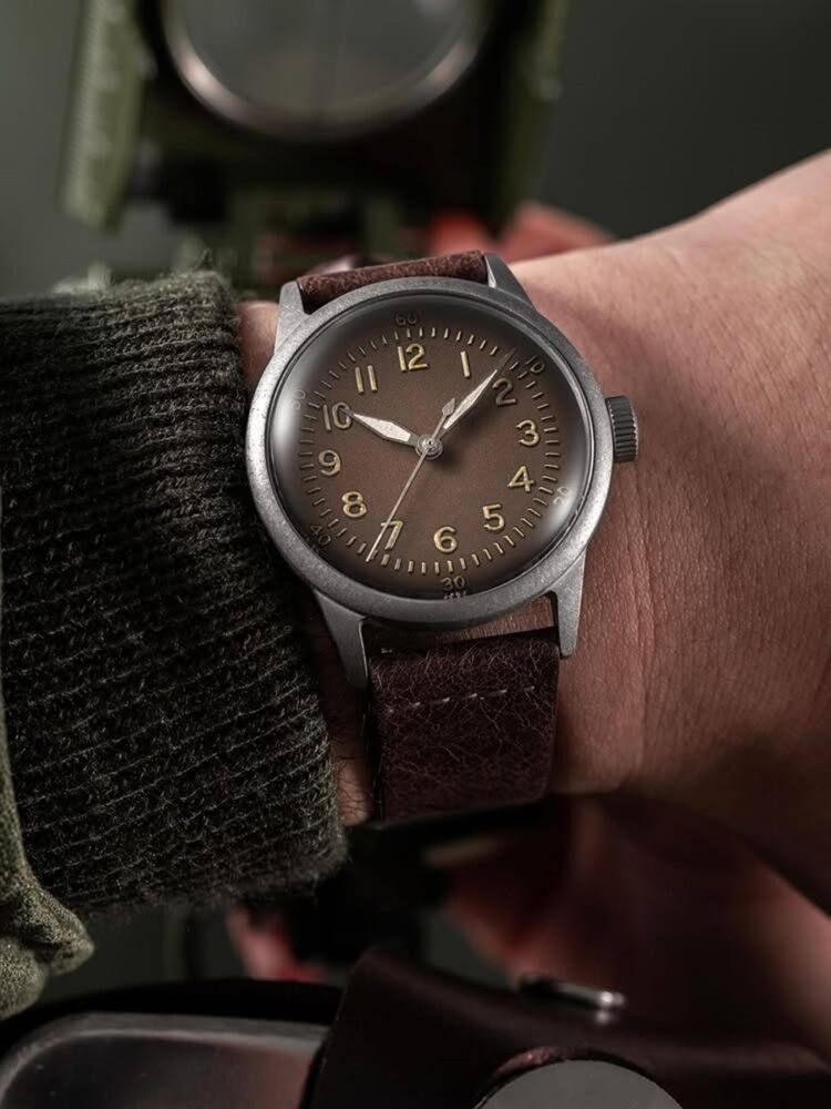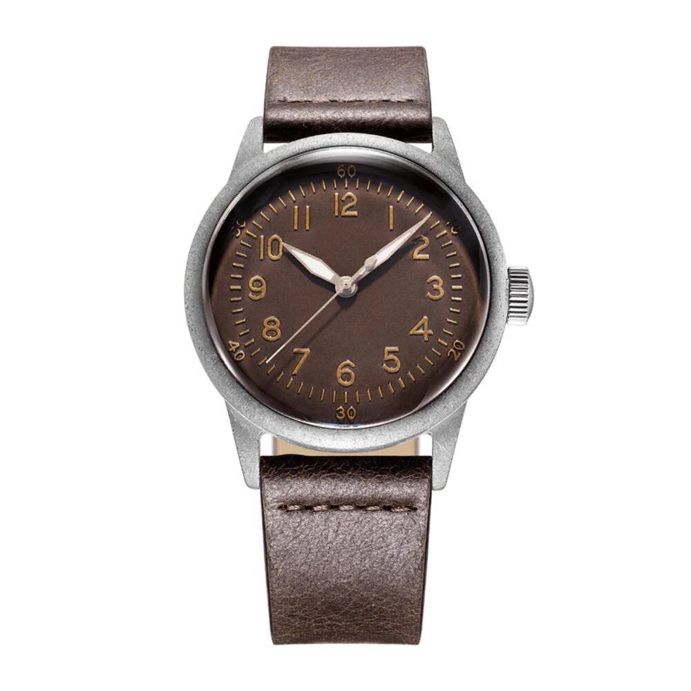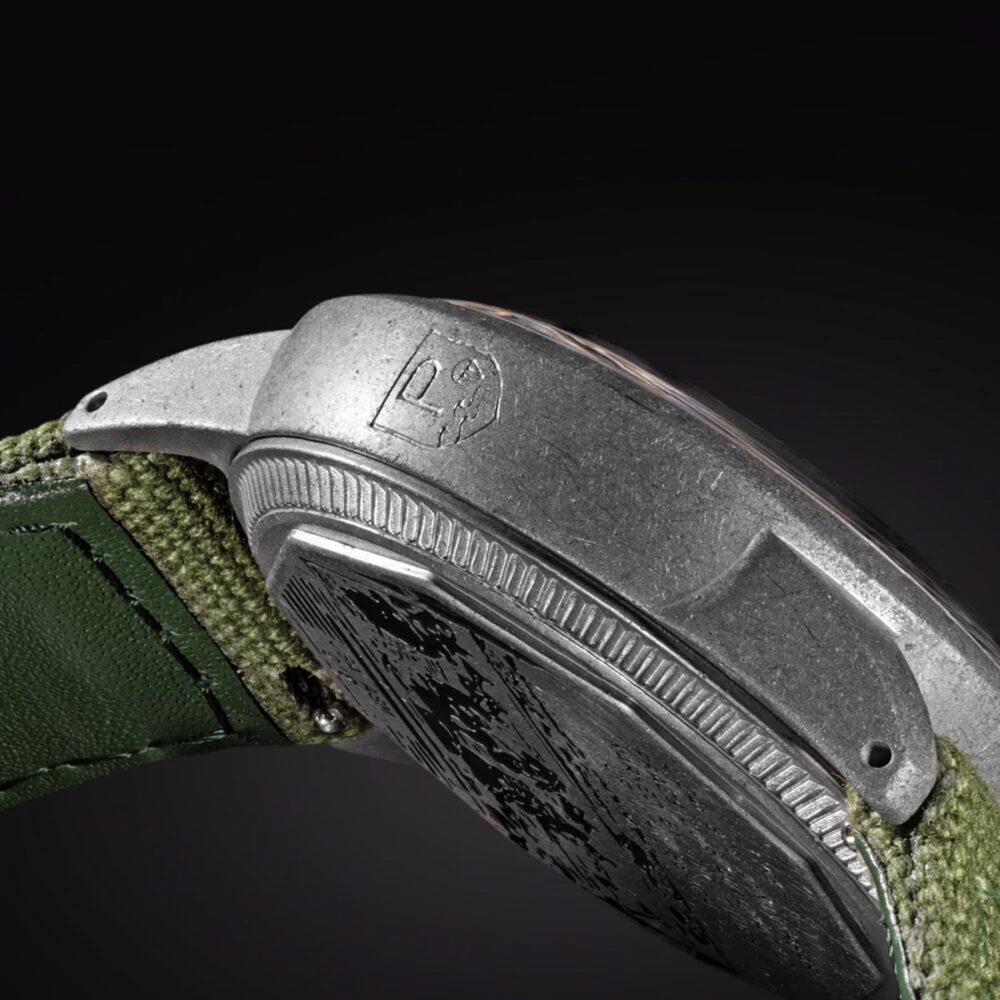 歴史に「着想を得た」時計ではなく、歴史そのものを刻んだ時計。ユタ・ビーチ沖の海に沈めることで自然にエイジングされたケースを採用。かつての牡蠣養殖手法を応用し、塩・太陽・砂に晒されることで、唯一無二の傷や色合いを宿す。これは人工的な加工ではなく、時と潮が刻んだ自然のパティーナである。文字盤はブラックとブラウンのエイジド仕上げで、インデックスも控えめにデザイン。ケースと文字盤が一体となり、荒波の記憶を伝える特別な一本となっている。