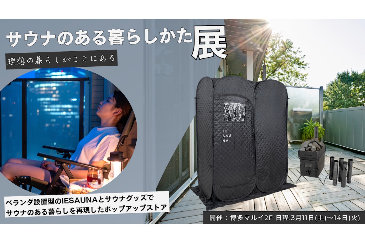 Vanwaves(ヴァンウェイブス)の家庭用テントサウナ『IESAUNA』(以下IESAUNA)は、博多マルイ2Fイベントスペースにて、IESAUNAを中心としたサウナグッズのポップアップストア「サウナのある暮らしかた展」を、 3月11日(土)~3月14日(火)の期間限定で開催する。 家庭...続きを読む