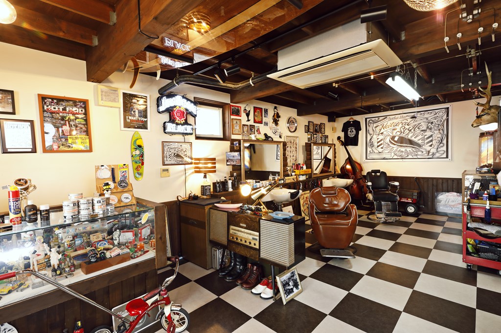 閑静な住宅街の中で異彩を放つ「DICE BARBERS CLUB」。サブウェイタイルとウッドを基調とした落ち着いた雰囲気で、味のあるヴィンテージ品が数多く使われている。そんな旧きよき時代の雰囲気に、ギターやUKのモーターサイクルジャケット、ネイティブアメリカンの民芸品、ロウブローアートなどが飾られ...続きを読む