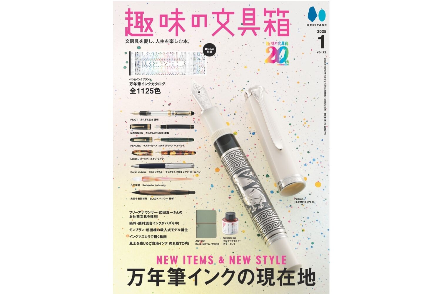 「趣味の文具箱」2025年1月号 vol.72の特集は毎年大好評の「万年筆インク」です。「万年筆インクの現在地」 と題した今回は、インクや筆記具の最新情報はもちろん、新しい技法やスタイルなど、さまざまな企画を用意しました。巻頭の綴じ込み付録「ペン&インクブランド 万年筆インクカタログ」は、前回よりも...続きを読む