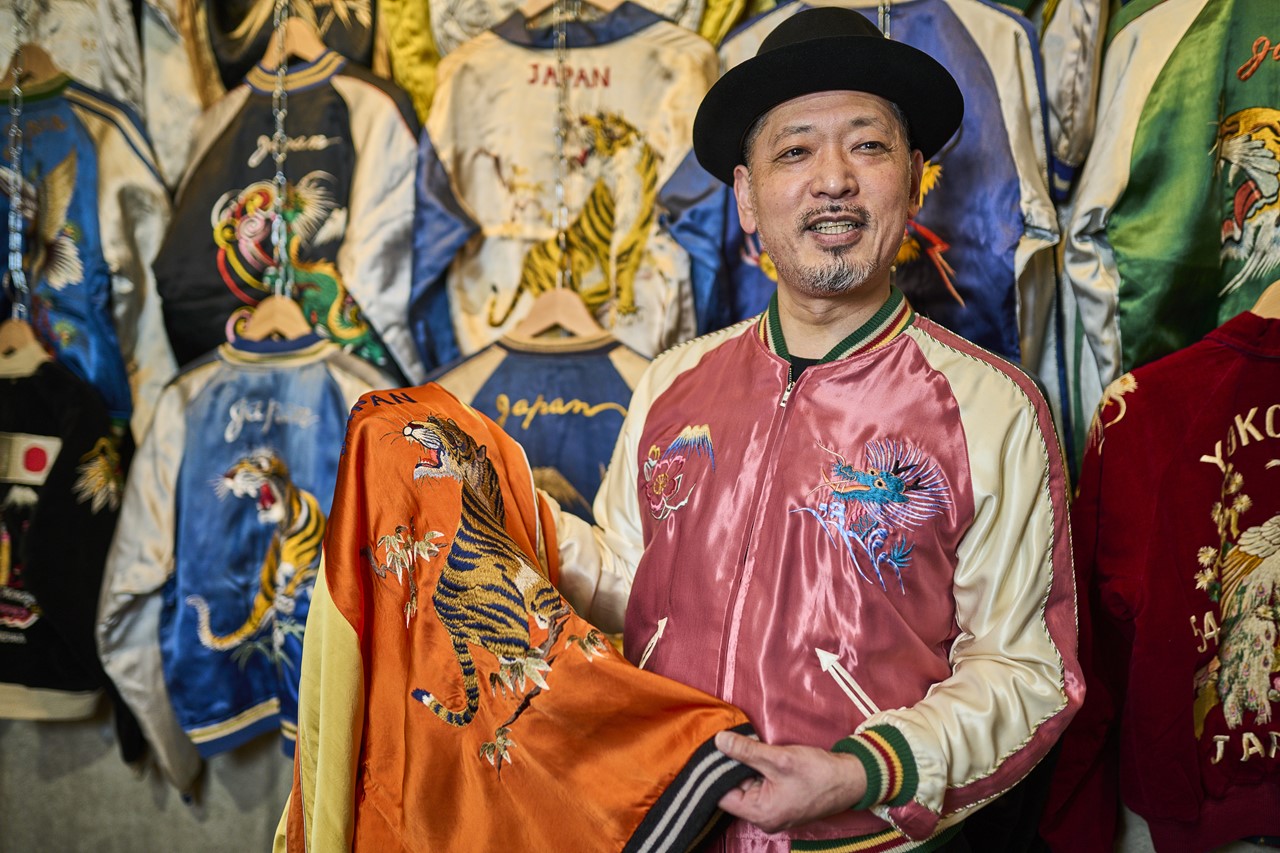 「ジャンキースペシャル」の名物マネージャー・カルロス西の、一歩先ゆく初秋のスカジャンスタイル。