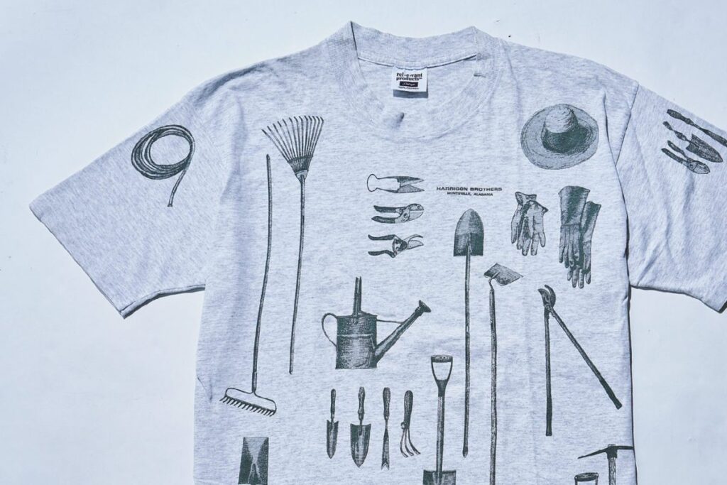 これです。ファッション誌「2nd」編集部で働く、私がずーーーと気になっているTシャツがこちら。見つけたらチョコチョコ買ってた総柄のT シャツなんですが、はじめて手に入れたのがこの農作業の道具が並んだ1枚だったかな。写実的に描かれた道具類が整然と並んだシュールなデザインに惹かれて、当時は詳細も...続きを読む