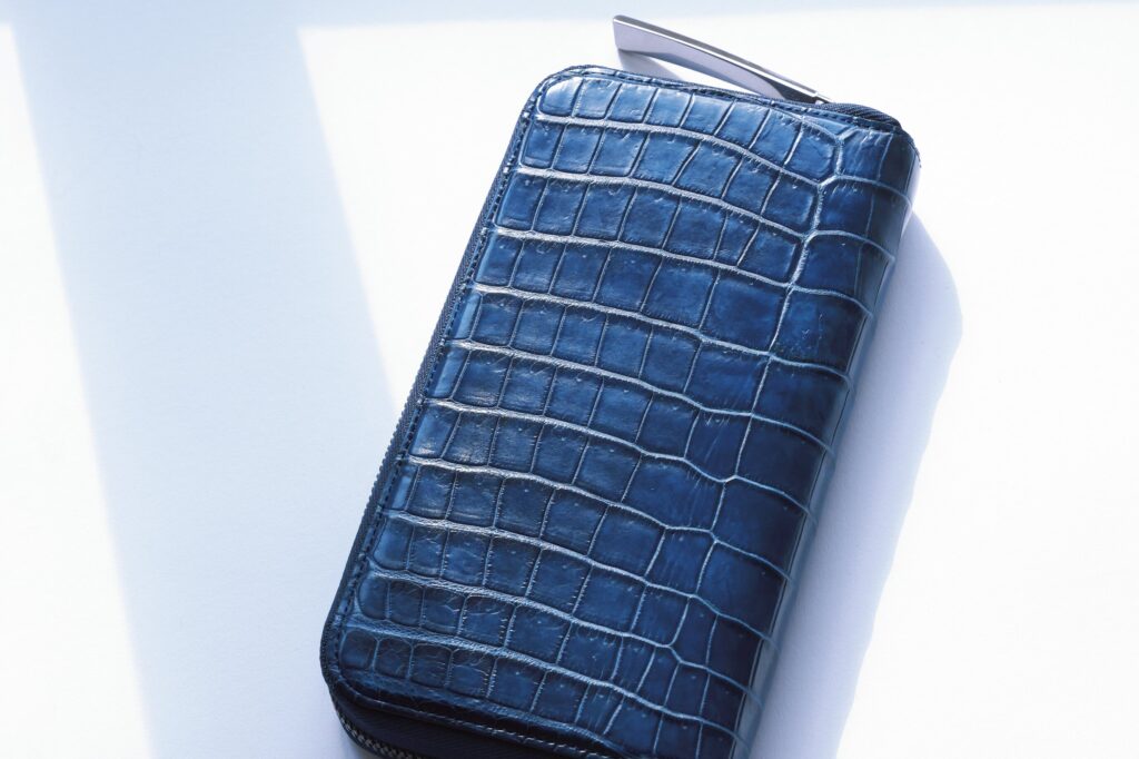 藍染めはとても難易度が高い染色である。それが、クロコダイル革だとしたらなおさら。原皮によっても染料の染み込み具合は異なるし気温や湿度にも色味が左右される。しかしクロコダイルと向き合い続けて80年の池田工芸が手掛ける、藍に染まったクロコダイルの斑模様は光の加減でさまざまな輝きを見せてくれる。 デニム...続きを読む